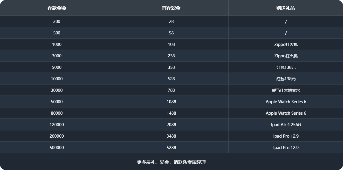 首存礼金:首存300送28+100,500送58+100 , 1000送108+78+100, 最高可送5288+28888